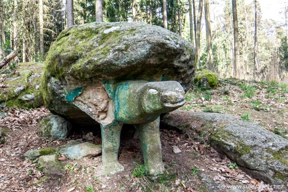 do podoby zvířat (želva, drak, žába). Patrné jsou i rozpadlé zbytky dalších kamenných zvířat.