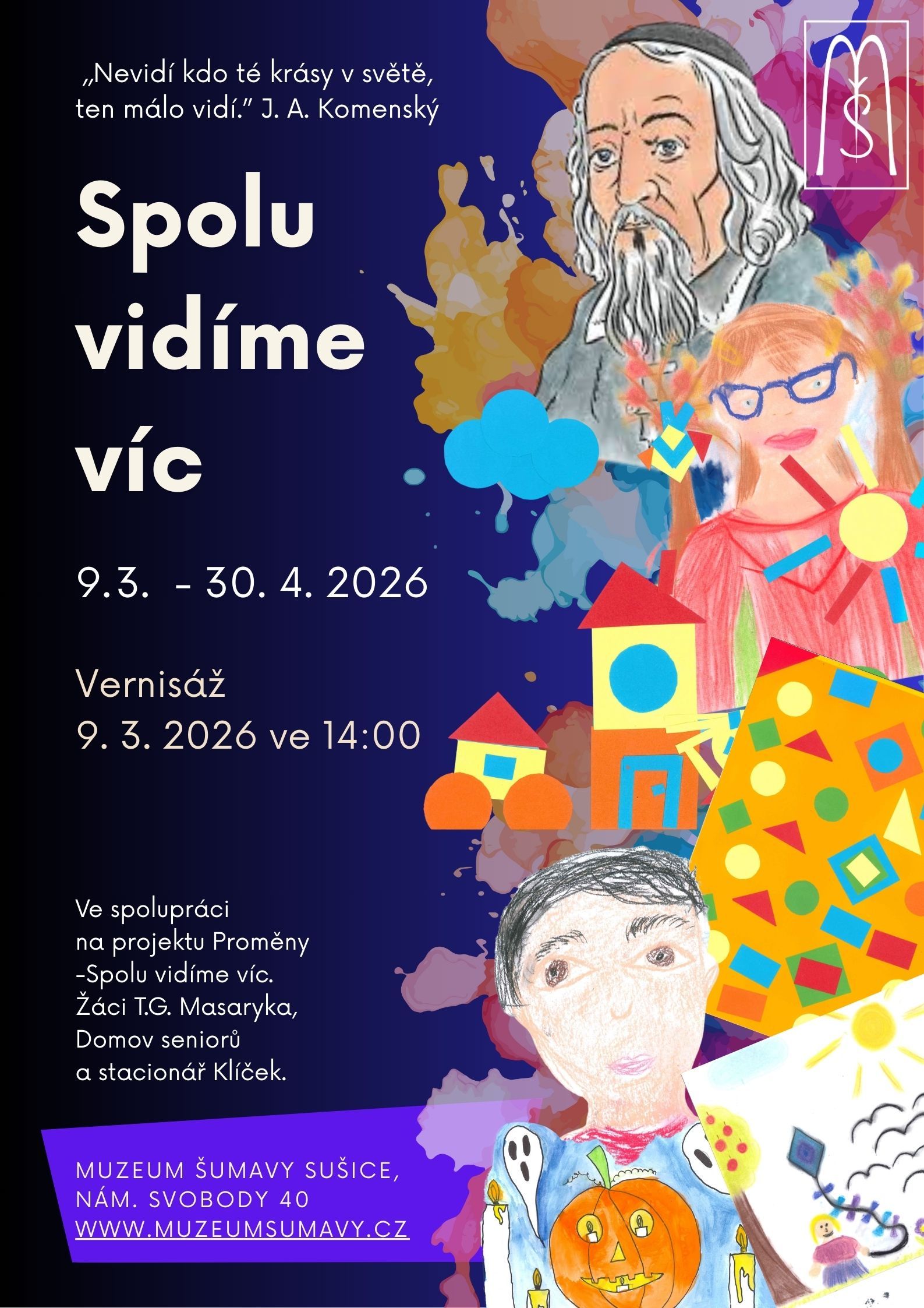 Ve spolupráci na projektu Proměny - Spolu vidíme víc. Žáci T.G. Masaryka, Domov seniorů a stacionář Klíček. Výstava Spolu vidíme víc vznikla v rámci celostátní soutěže Měníme svět k lepšímu s Komenským, která navazuje na odkaz Jana Amose Komenského a jeho víru v lidskost, vzdělanost a vzájemné porozumění. Projekt je inspirován jeho myšlenkou: „Není-li kdo té krásy v světě, ten málo vidí.“ Cílem projektu bylo rozvíjet mezigenerační a meziskupinové vztahy prostřednictvím společné výtvarné tvorby. Do projektu se zapojili žáci 5. ročníků základní školy T. G. Masaryka Sušice, klienti domova pro seniory v Sušici a klienti denního stacionáře pro osoby se zdravotním postižením Klíček. Společně tvořili, malovali, kreslili a fotografovali. Učili se spolupracovat, naslouchat si a objevovat krásu v rozdílnosti i podobnosti. Součástí projektu byla také výroba pohlednic s výtvarnými díly všech zúčastněných. Ty byly prodávány na školním jarmarku a výtěžek byl využit k podpoře další výtvarné činnosti seniorů a osob se zdravotním postižením. Závěrečná výstava představuje výsledky tohoto společného snažení a zároveň symbolicky uzavírá celý projekt. Je především setkáním generací, svědectvím spolupráce a důkazem, že umění dokáže propojovat lidi bez ohledu na věk či omezení. (Zapsal: Muzeum Šumavy, 20.02.26) | ||
